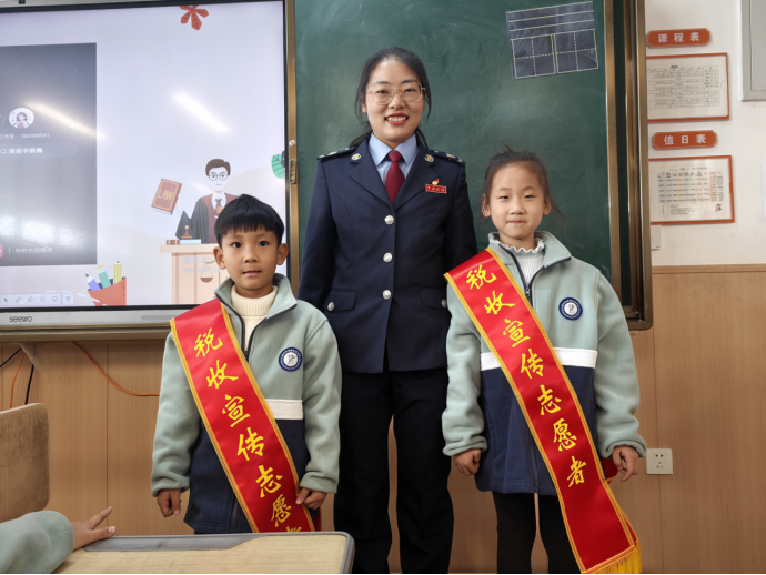 为增强活动的趣味性和参与感,现场还设置了“税收知识小问答”“校园普法歌”和“我是小小税收宣传员”体验环节。同学们踊跃举手,争相回答关于宪法和税收方面的小问题,一边比划手势一边齐唱《校园普法歌》,在轻松愉快的氛围中巩固了所学知识。几名同学在税务人员的指导下,佩戴上“税收宣传志愿者”的绶带,兴奋地表示要将学到的知识分享给家人和朋友。